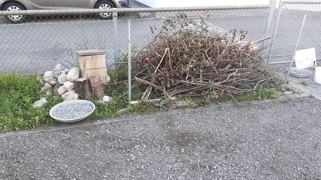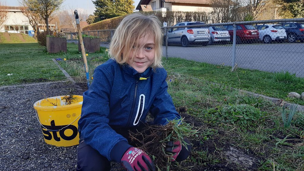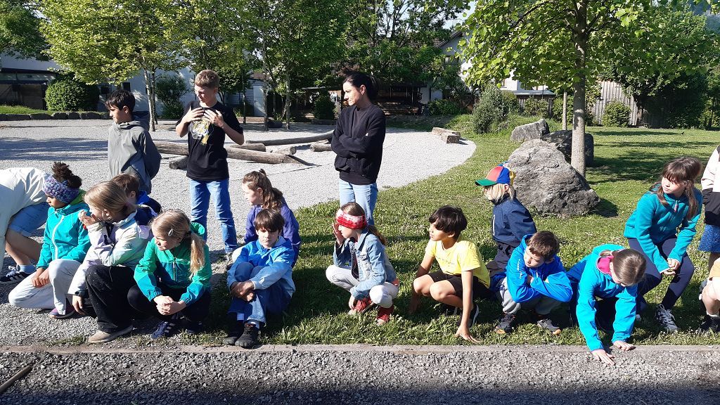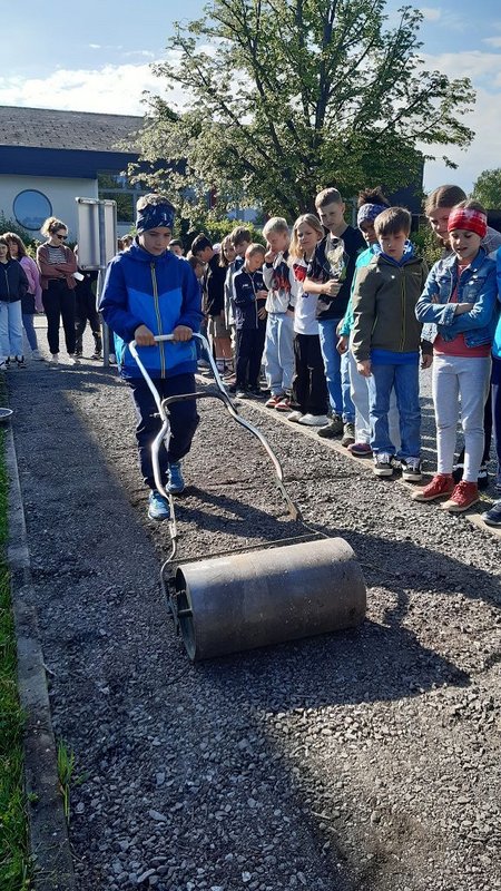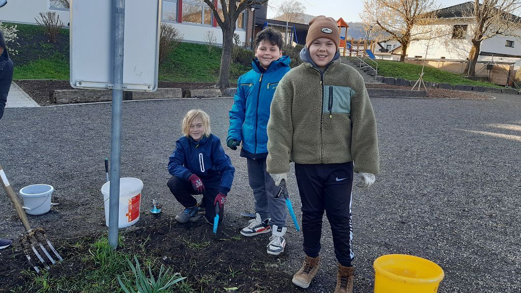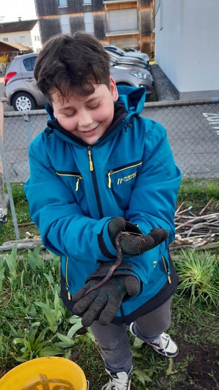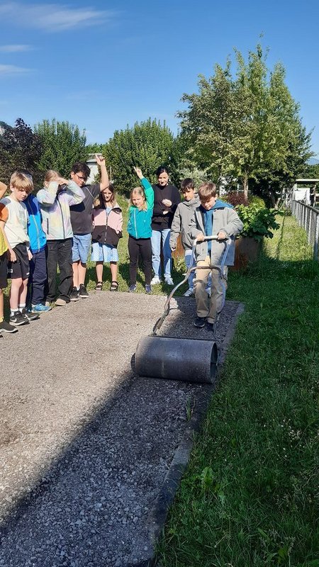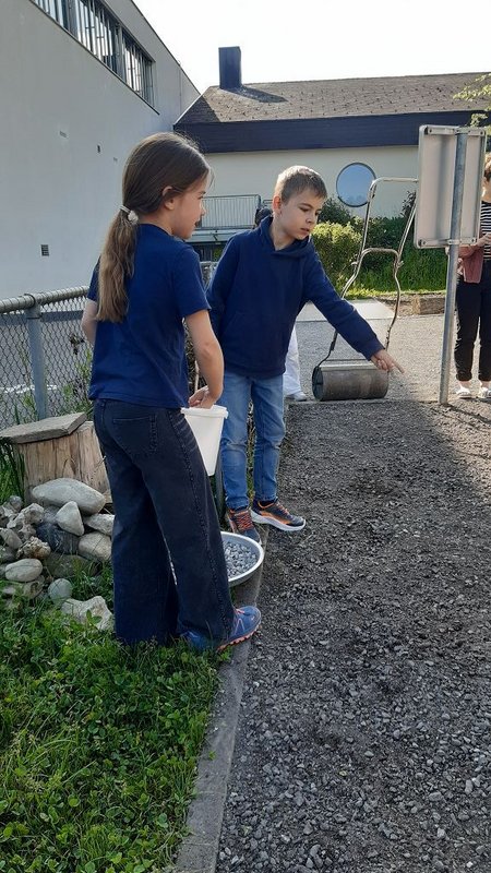 Im Praxisteil gestalteten die beiden Klassen das Blumenbeet im hinteren Pausenhof neu. Unkraut wurde fleißig gejätet und die Erde für eine Neueinsaat mit heimischen Wildblumen vorbereitet. Eine kleine Benjeshecke und ein Steinhaufen sind entstanden und eine Insektentränke wurde aufgestellt.