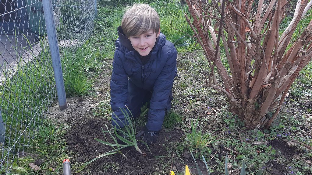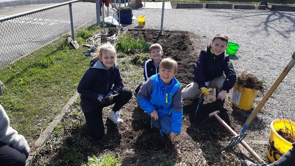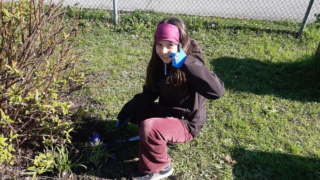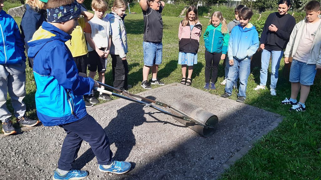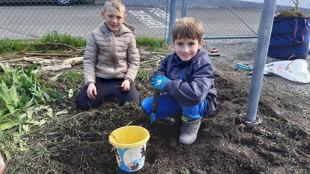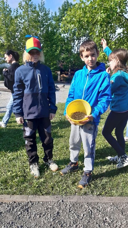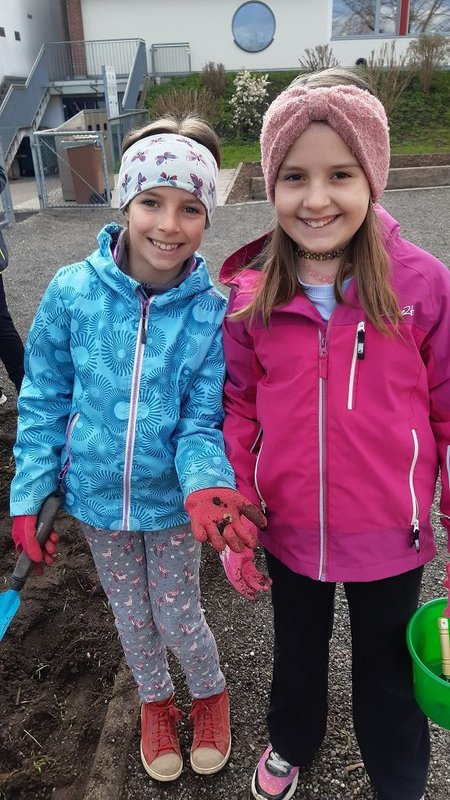 Im Praxisteil gestalteten die beiden Klassen das Blumenbeet im hinteren Pausenhof neu. Unkraut wurde fleißig gejätet und die Erde für eine Neueinsaat mit heimischen Wildblumen vorbereitet. Eine kleine Benjeshecke und ein Steinhaufen sind entstanden und eine Insektentränke wurde aufgestellt.